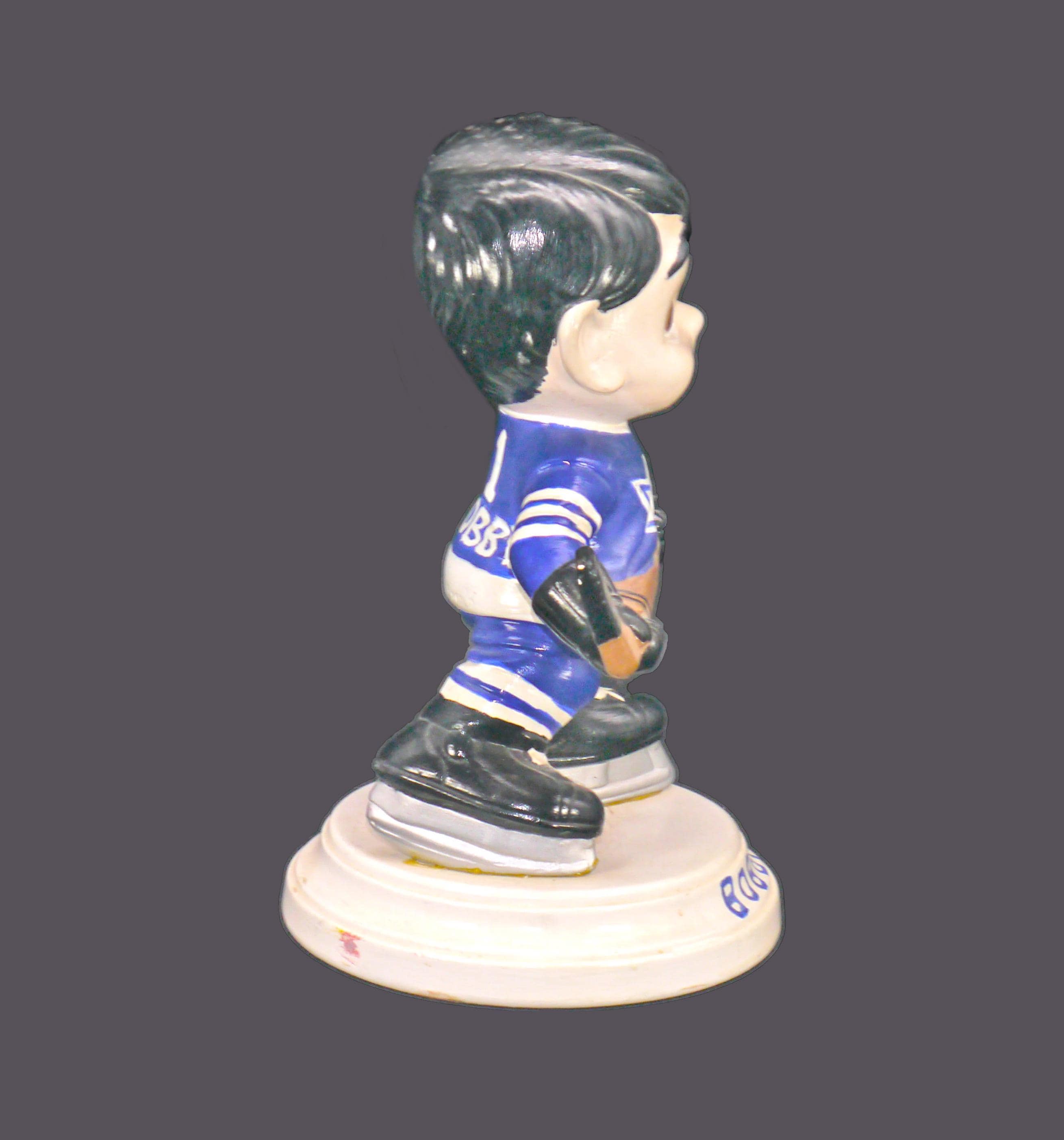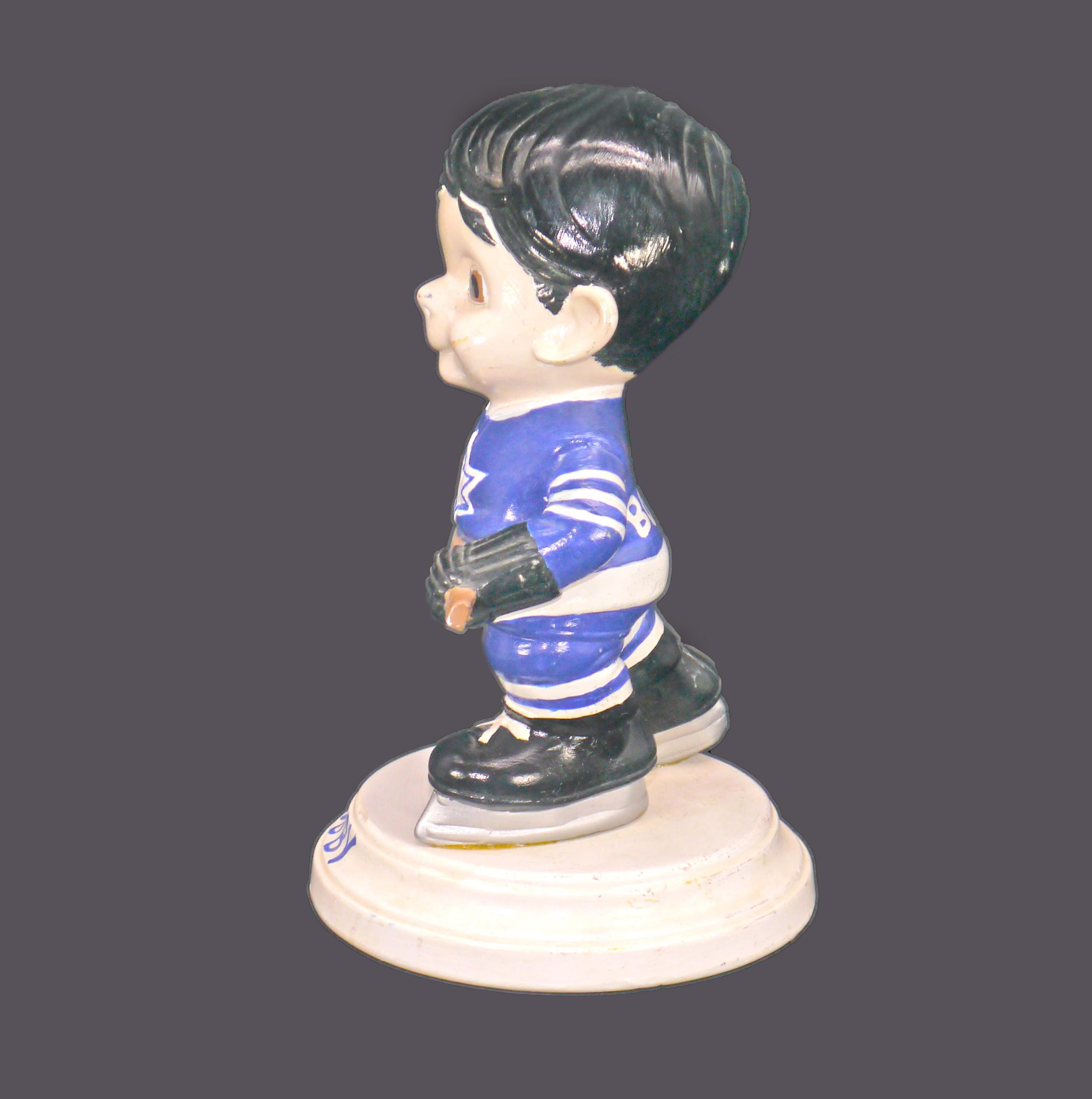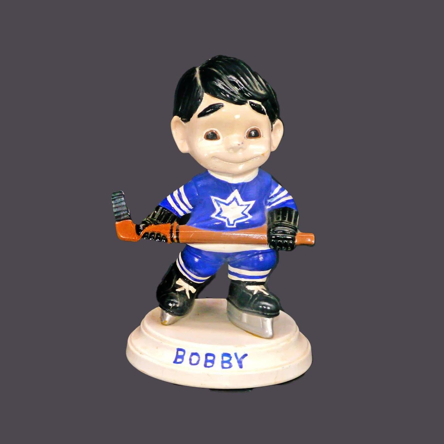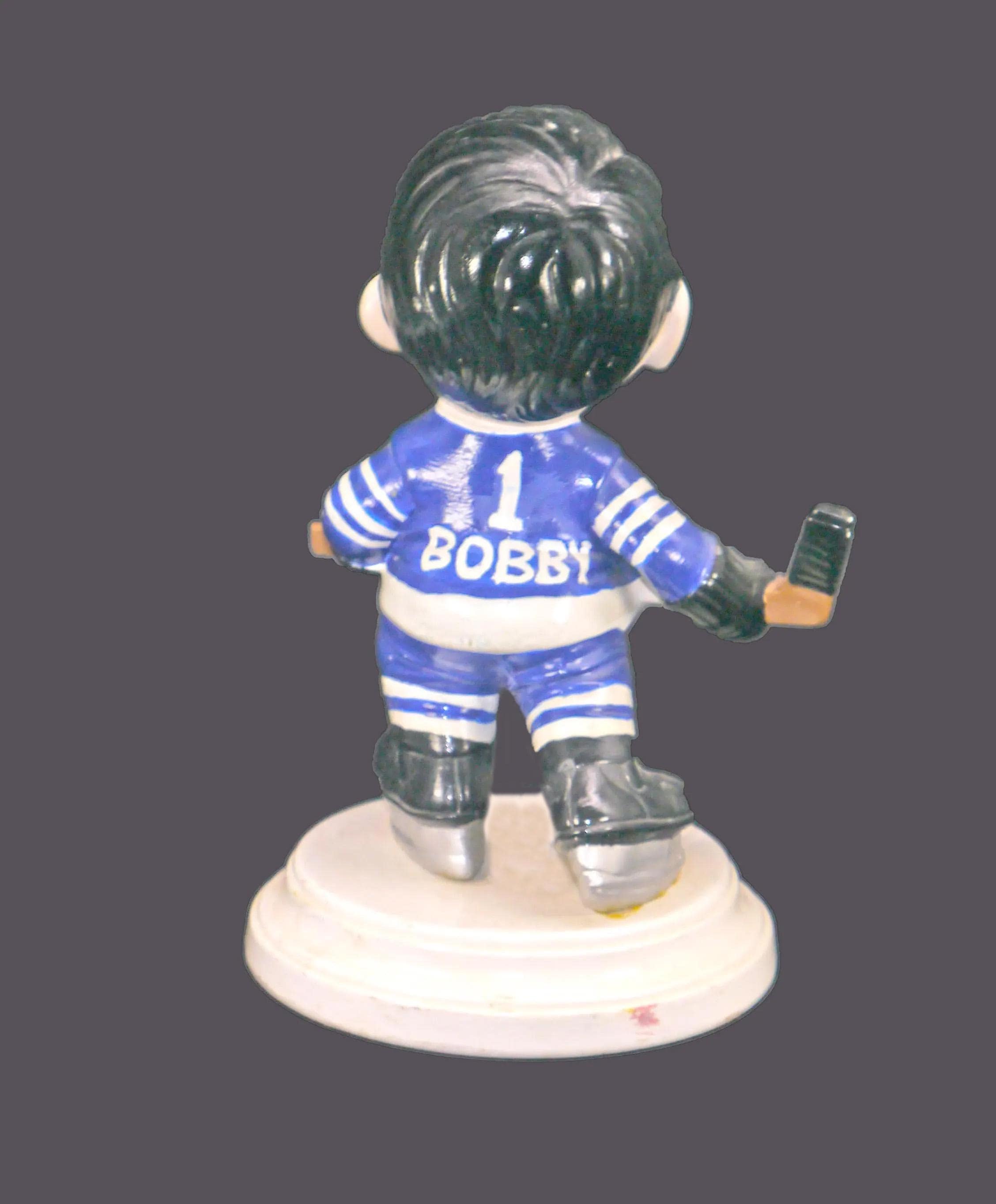 Vintage poly-resin hockey player figurine named Bobby with the #1 in a Maple Leaf's uniform holding his stick and ready to roll onto the ice and score