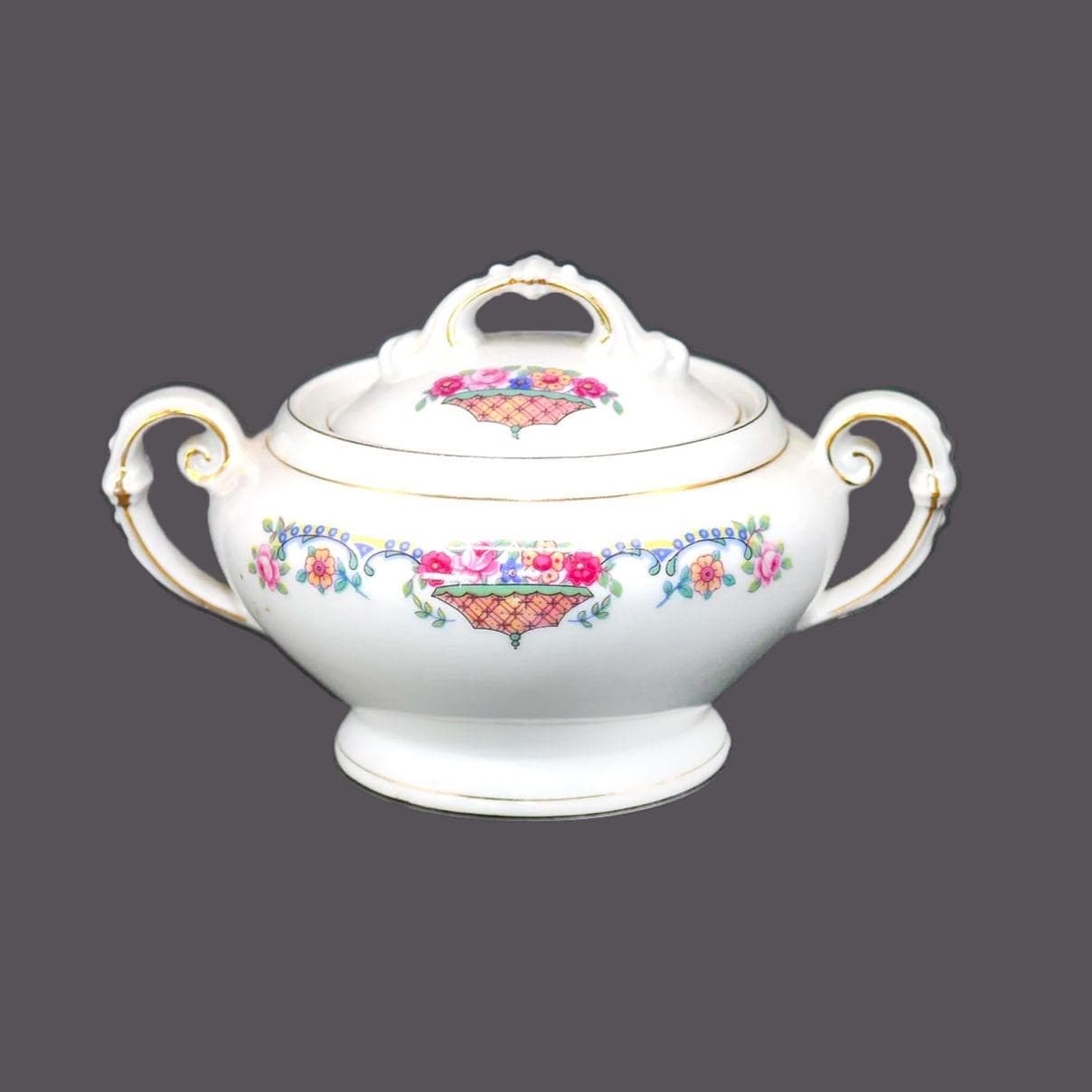 Vintage (late 1930s) Victoria China 264 covered, double-handled sugar bowl. Flowers in wicker baskets and gold bands and accents. Extremely well-crafted translucent Czechoslovakian | Bohemian porcelain.