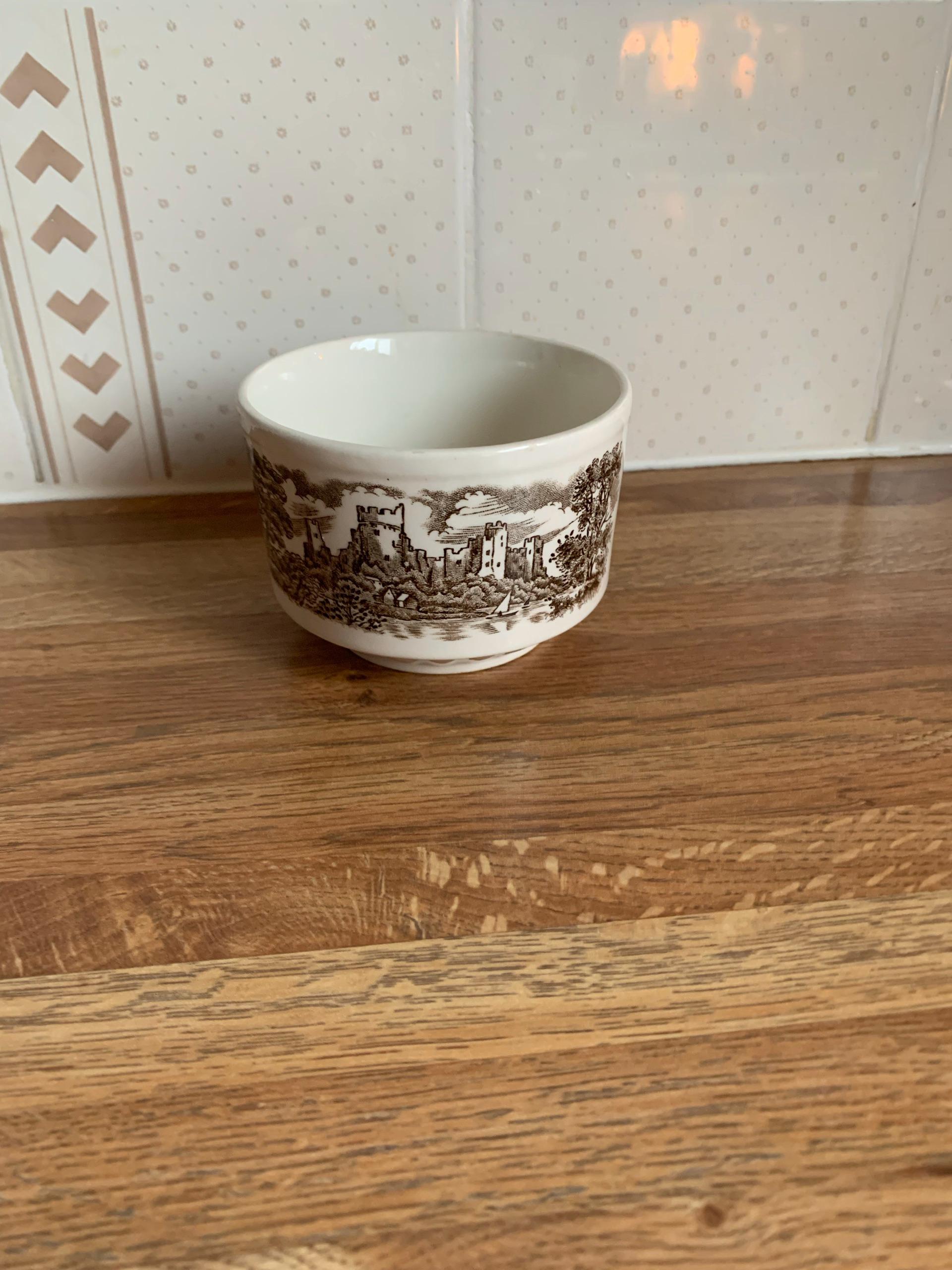 Vintage (1970s) English Ironstone Tableware | EIT Castles Brown open sugar bowl made in England. Brown transferware castles, landscape imagery.
