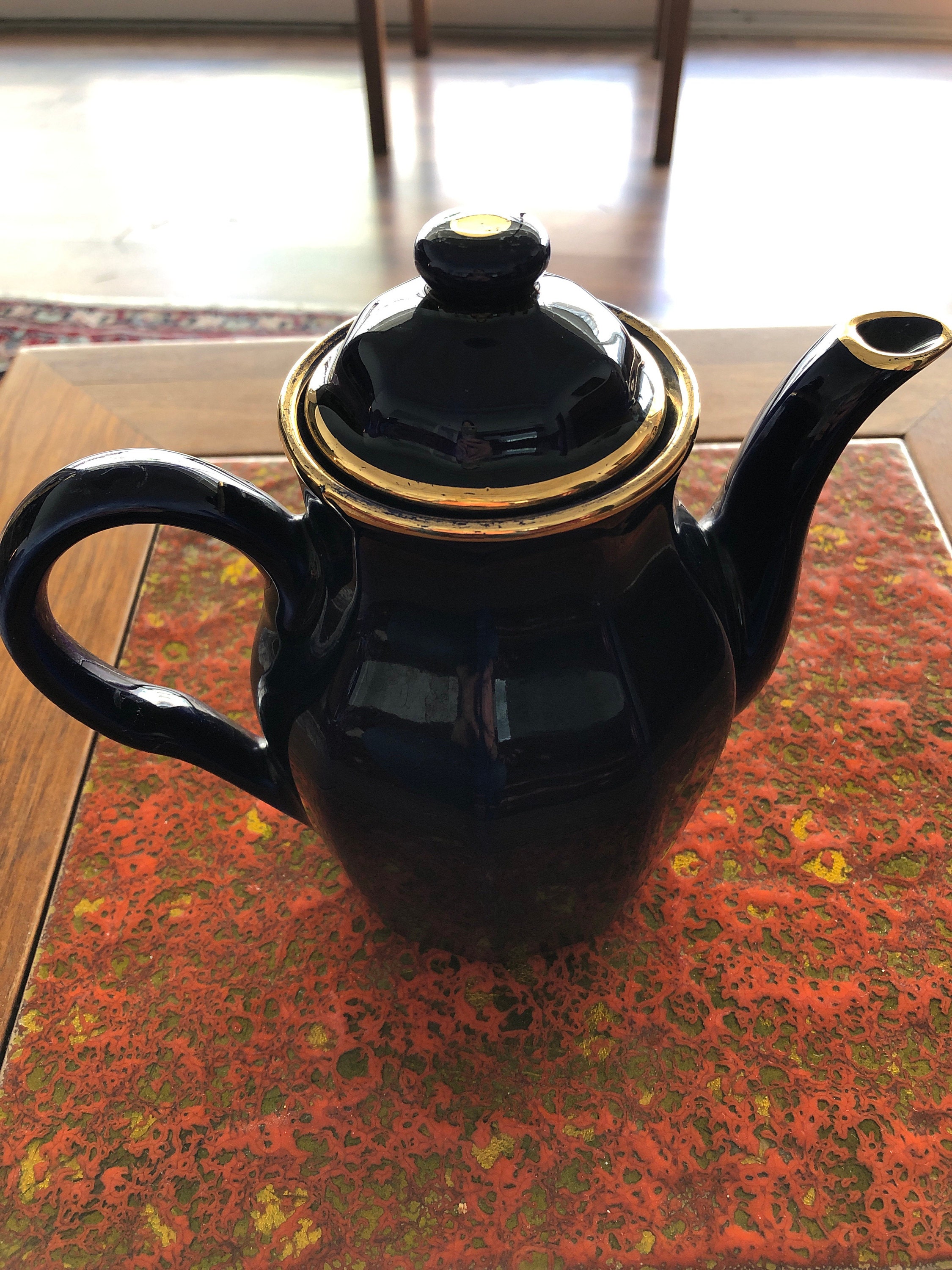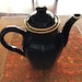 Vintage (1960s) Porcelain a feu Delaunay Apilco espresso or coco pot. Vintage hotelware | restaurantware made in France for F. Trauffler Ltd., London, England. Cobalt blue with gold accents.
